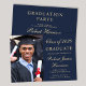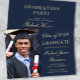 O anúncio e o convite de festas moderno e clássico do azul escuro e do formandos de ouro com uma foto do formando, seu nome e ano de aula em um roteiro elegante e sua universidade, major e honraria. No verso, adicione os detalhes da sua parte de formando.