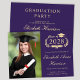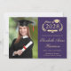 Formandos roxo moderno, anúncio e convite de festas com "Classe de" dentro de uma coroa de louros, um boné e diploma de formando de ouro, uma foto do formando, e seu nome em um roteiro elegante de ouro leve. Acrescente sua escola, major, honras, planos futuros, etc., na tipografia de ouro leve moderna. No verso, adicione os detalhes da sua festa.