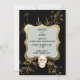 Este elegante convite de Halloween tem decorações de ouro em fundo preto. O quadro tem uma forma geométrica elegante que envolve o texto que pode ser personalizado para sua festa de Halloween ou do Dia de los Muertos. Na parte inferior do convite da parte temática de outubro está um crânio de aquarela. O verso tem floral de ouro.