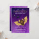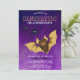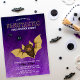 Convidado do Festa de Halloween para crianças com fundo roxo malhado, morcego mostrando suas presas, duas aranhas assustadoras e um modelo moderno com a palavra "fangtástico".