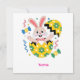 Uma ilustração super divertida e festiva de um coelho fofo com gravata borboleta explodindo de um ovo floral amarelo, cercado por doces coloridos e confetes. Este design alegre é perfeito para lembrancinhas de festa de Páscoa para crianças, adesivos para laptop e ímãs festivos. Celebre o feriado com uma explosão de cor e doçura!