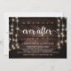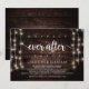 Linda festa Felizes para Sempre, cartão de anúncio / convite de Elopamento de casamento, em madeira de fazenda rústica, design de luzes de corda. Isso é perfeito para o seu casamento e festa de celebração pós-casamento. Adicione seus detalhes na fonte / letra correspondente.