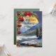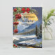 Um convite de festas artístico e festivo de Natal que apresenta uma terra maravilhosa de inverno com pinheiros, enquadrada por um padrão vermelho e azul de bolinhas. Verde elegante, neve e bolhas de Natal completam a cena. No verso está uma design verde e vermelha de bolinhas.