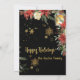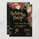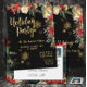 Um feriado elegante e clássico convida em fundo preto clássico com buquês florais vermelhos de feriado e verde everdeado com caligrafia de ouro brilhante e um borrão de flocos de neve delicados, convidando seus hóspedes para comemorar suas festas de Natal. A parte de trás da placa dobra como uma carta de feriados felizes.