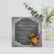 Este design de feriado apresenta rosas laranja, roxo e preto e folhagem em torno de um quadro de quadro negro dourado. Suas informações personalizadas do Partido do Halloween podem ser adicionadas editando as caixas de texto fornecidas. No verso está uma textura de cinza. #halloween #feriados #sazonal #festivo #festa #halloweenparty #floral #botânico #grunge #gothic #convites #rosa ##preto #cinza #cinza #laranja #ouro #assustador #partysupply #estationery #elegante #na moda #elegante #trendendência # #popular #design #designer estilo