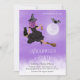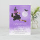 Convocação de Festa de Halloween, Testemunha Ortográfica! Esta design cativante mostra uma cena noturna mágica de lua de cheio, onde a jovem bruxa e o seu gato negro voam através de um céu noturno roxo em sua vassoura. Ideal para jovens bruxas e bruxos, este convite promete uma noite cheia de aventuras encantadoras e diversão assustadora. Que comece a magia do Dia das Bruxas!