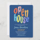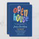 Um convite colorido e divertido para uma festa de casa aberta. Este convite fabuloso apresenta uma tipografia moderna e ousada em um fundo azul. Fácil de personalizar com os detalhes da sua festa de casa aberta ou celebração de aniversário.