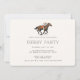 Convite de Festa do Derby de Cavalos de Corrida Moderno com ilustração de um cavalo de corrida com jóquei e padrão listrado no verso. Todos os elementos de texto podem ser alterados para que este design seja usado para outros eventos também: convite de casamento equestre sofisticado, festa de aniversário de cavalo, festa de observação do derby, inauguração de estábulo de cavalos e muito mais. O fundo, a cor da ilustração e as cores do texto podem ser alterados usando a ferramenta de design!