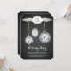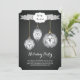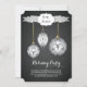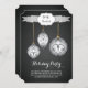 Convite simplesmente elegante da festa de Natal que caracteriza bolas bonitas do White Christmas com os flourishes do redemoinho do rico do preto que penduram das linhas do ouro embellished com uma bandeira & um grupo da fita em um fundo fino preto da listra.