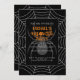 Convite para festas de Dia das Bruxas Pretas na Web Spider. Personalize o convite do Hallow com o Halloween da aranha branca. Com texto branco e aranha cinza.