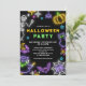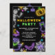 Convite para Festas de Halloween. Prepare-se para uma diversão assustadora com este convite de festas de fantasia neon Halloween apresentando esqueleto de neon, abóbora, aranha, bruxa malvada, teia de aranhas e morcegos.