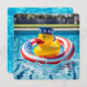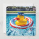 Pato amarelo flutuando com um salva-vidas da bandeira americana em uma piscina usando um chapéu patriótico para convite de festa na piscina.
