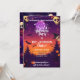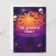 Celebre o Halloween em estilo com este convite de festas personalizado com crânios assustadores, morcegos e uma lua roxa brilhante. Perfeito para uma comemoração de Halloween amistosa à família ou para um evento caseiro assombrado, este cartão define o clima para uma noite de truques, guloseimas e diversão assustadora.