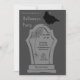 Este convite da festa de Halloween tem uma sensação assustadora com uma ilustração de uma lápide ou lápide com aranha e teia e um corvo preto comprado em cima. A lápide está pronta para ser personalizada com todos os detalhes do seu partido. O lado inverso tem um padrão de tombstones e fantasmas assustadores.