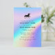 Convite de festa holográfico minimalista simples e elegante com um design limpo e elegante, lindo para casamento, chá de noiva, 1º aniversário, aniversário, festa corporativa, festa de 16 anos, despedida de solteira, chá de bebê e qualquer celebração. Unisex, colorido e atraente, mas profissional e formal. Crie seu convite holográfico único adicionando sua foto personalizada, clip-art, ícone ou qualquer imagem, ou deixe esta linda silhueta de unicórnio preto como imagem de cabeçalho.