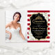 Quinceanera convite de festas com sua foto. Apresenta faixas brancas escuras e vermelhas, fontes de script, rosas brancas, tiara e confetti. Design vermelho preto clássico com ouro brilhante. Perfeito para uma celebração elegante.