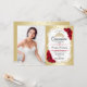 Quinceanera convite de festas com sua foto. Apresenta fontes de script, rosa vermelha, tiara e confetti. Design vermelho branco clássico com ouro brilhante. Perfeito para uma celebração elegante.