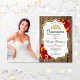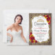 Quinceanera convite de festas com sua foto. Apresenta padrão de madeira rústico, fonte de script, rosas vermelhas, girassóis, tiara e confetti. Design vermelho preto clássico com ouro brilhante. Perfeito para uma celebração elegante.