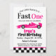 Convite de festas Rápido De primeiro aniversario De Rapariga De Corrida Rosa. Convite de festas Modelo Fast One Pink Race Race Car Girl, editável, inicie seu motor com estes convites de alto-octano e assista a sua corrida em direção a uma celebração inesquecível.Perfeito para o grande dia do seu pequeno acelerador! Personalizou seus convites com o nome, data e detalhes do evento.