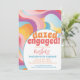 Um itinerário divertido de fim de semana de despedida de solteira e convite. Este design retrô apresenta um arco-íris abstrato ondulado pastel em laranja, roxo e azul. Fácil de personalizar com os detalhes da sua festa de despedida de solteira. Um design 'atordoada e comprometida' que vai se destacar da multidão.