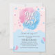 Este tipo azul e cor-de-rosa giro revela que o cartão de convite de festas apresenta pés de bebê cor-de-água em cor rosa e azul com corações em cor rosa e azul. O texto diz "Menino ou Menina? O que será o bebê. Perfeito para uma festa reveladora de gênero.