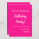 Esta é uma design de festa de aniversário de tipografia na moda. Este design simples e chic, está em um rosa quente com tendência com a tipografia de na moda. Tem a mensagem "Festa de aniversário de Alexandria! com espaço para você adicionar seu nome, festa e informações de RSVP. É perfeito para a sua celebração de aniversário temático rosa-quente. Para personalizar, basta adicionar seu nome e detalhes da festa na caixa de texto personalizar este texto. Altere-o alterando facilmente a cor ou a fonte, usando a ferramenta de editor de design! Para obter ajuda com personalização, produtos correspondentes ou para um projeto personalizado, entre em contato comigo via chat zazzle.
