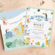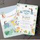 Modelo de convite para o primeiro aniversário bonito com animais safari da selva, arbustos, aves exóticas e balões em cores modernas e modernas. Alguns dos animais ilustrados incluem, um macaco, girafa, leão e uma zebra. Adicione facilmente os detalhes da parte clicando no botão "Personalizar".