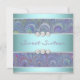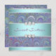 Convite de festa de aniversário de dezesseis anos com tema pavão em paisley roxo e azul turquesa.