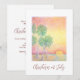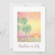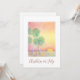 Natal no convite de festas de julho com tipografia de guião e design de praia tropical com palmeiras ao pôr do sol. Com a inscrição personalizável vermelha, você pode adicionar suas próprias informações. Uma forma festiva de adicionar um toque de verão à sua celebração de feriado.