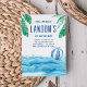 Chute o verão com um cesto ao lado da piscina! Nossos convites de festas de aniversários de piscina de verão apresentam água azul com uma bola de praia listrada azul e branca e folhas de palma tropicais no topo.