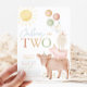 Festa de segundo aniversário de animais de fazenda - Um convite de segundo aniversário para os seus filhos festas de aniversário. O nosso design apresenta uma lindíssima vaca aquosa, porco, ovelha e pato com balões, sol, flores e borboletas em tons vermelhos, mostarda e verdes.