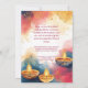 A frente do convite mostra um fundo de aquarela impressionante em marrom, turquesa e amarelo, misturando lindamente uma canvas branca. O elegante e fluente roteiro exibe os detalhes do evento, enquanto três lâmpadas Diya pintadas manualmente adoram o fundo, adicionando um toque de encanto tradicional. Intrair padrões florais e delicadas decorações em matizes que combinam o design, criando uma atmosfera festiva e convidativa. A parte de trás da carta continua o tema vibrante da aquarela, oferecendo espaço para textos personalizáveis e desejos de Diwali, elegantemente bordado por mais lâmpadas de Diya e sofisticados sotaques decorativos. O olhar geral é brilhante, quente e perfeito para celebrar Diwali