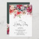 Convite do Partido Elegante Feriado, com flores de inverno - poinsettias, em tons ricos de vermelho, burgundy, cremes e marfim, bagas festivas, verde-luxuoso e sotaques de dourado falso. O modelo é combinado com uma combinação de escrita manual de scripts de caligrafia e fontes serif.