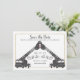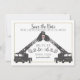 Bombeiro, noiva e noivo em caminhões de escadas. Salve a data com este único caminhão de bombeiros, anúncio do bombeiros com fotos no verso.