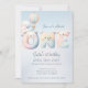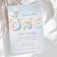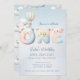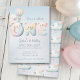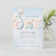 Pastéis macios, ursos brincalhões, e céus sonhadores dão o tom para uma primeira comemoração de aniversário! Este adorável convite contém a palavra "UM" ilustrada com rostos doces de ursos e um balão de ar quente e caprichoso, criando uma vibração mágica e suave perfeita para o grande marco de uma pequena. Colocado contra um fundo azul claro do céu.