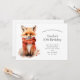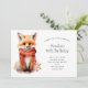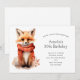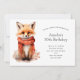 Convite de aniversário com uma ilustração de um filhote de raposa laranja-avermelhado. Um sorriso sutil em seu rosto. Usando um lindo cachecol vermelho para se aquecer.