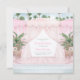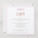 Este convite de fim de semana da despedida de solteira apresenta uma linha de cabanas cor-de-rosa e listradas brancas. Todos os detalhes do evento podem ser editados para atender às necessidades de sua fuga. Na parte de trás está um par de piscinas e um guarda-chuva listrado rosa e branco. Abaixo está o Itinerário para que seus convidados saibam tudo o que você planejou.