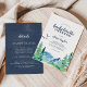 Este fim de semana de despedida de solteira Rocky Mountain com convite detalhado é perfeito para um evento ao ar livre. O design apresenta uma paisagem de natureza selvagem pintada, azul e verde, com pinheiros de aquarela, pássaros e montanhas.