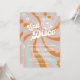 Festa de despedida de solteira com itinerário em estilo retrô dos anos 70 com letras descoladas, flores de margarida e bola de discoteca. Adicione detalhes do fim de semana no verso.