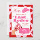 Convide seus amigos para uma festa nash divertida com nosso último convite para solteirona de rodeio. O design apresenta um padrão de vaca vermelho e rosa. Um chapéu de vaqueira rosa e uma vaqueira selvagem vestindo botas de padrão de vaca vermelho e rosa. Perfeito para sua última despedida de solteira/galinha.