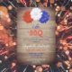 Eu tenho CHURRASCO com florais patrióticos, vermelhos, brancos e azuis contra um fundo de madeira rústica