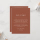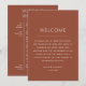Traga calor e caráter para a sua celebração com este cartão de itinerário de linha do tempo do fim de semana do casamento em terracota rica, também conhecida como sienna. A tonalidade terrosa evoca argila queimada pelo sol e pores do sol dourados do deserto, tornando-a uma escolha perfeita para casamentos de outono ou final de verão. Projetado com um layout limpo e minimalista, ele guia seus convidados por cada evento, ao mesmo tempo em que adiciona um toque de elegância boho à sua suíte de papelaria. Ideal para celebrações rústicas, no deserto ou em destinos. Também é um acréscimo atencioso à sua bolsa de boas-vindas, garantindo que seus entes queridos se sintam informados e acolhidos desde o primeiro momento. Disponível como cartão impresso ou download digital conveniente.