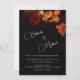 A dramatic and elegant wedding invitation featuring high-contrast 3D botanical illustrations on a deep black background. Perfect for a moody autumnal or winter wedding theme with a sophisticated aesthetic. With the bride's and groom's first names only in an elegant calligraphic script and full names on the backside.