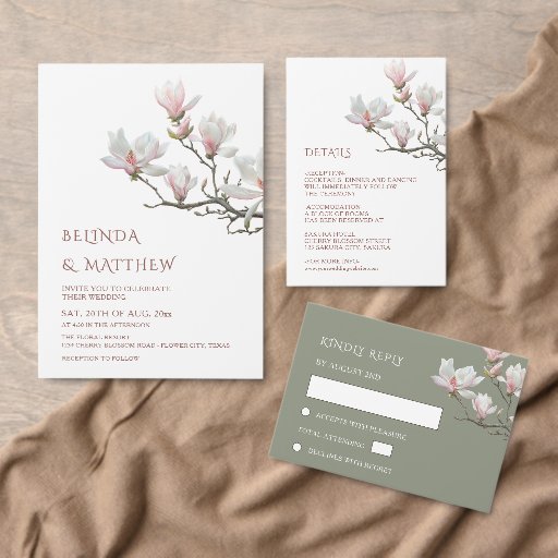 Fine art painted magnolia flowers on a sage green background casual wedding invitation.