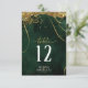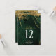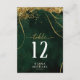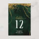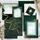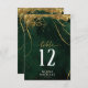 Um fundo de aquarela em tons de verde esmeralda é tocado por um abstrato de linhas de ouro finas e efeitos de iluminação reluzentes para criar as peças desta bela suíte de casamento. A carta de número da mesa de casamento mostrada aqui também apresenta uma caligrafia elegante e uma modelo para adicionar facilmente seus próprios nomes, data de casamento e números de mesas. Procure ID867 para ver outras peças e opções de cores para este conjunto.