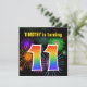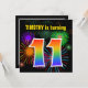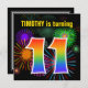 Este design de convite de aniversário vibrante e divertido apresenta um padrão colorido inspirado em fogos de artifício comemorativos que explodem, juntamente com o número "11", tendo um espectro multicolorido como o arco-íris ou um padrão de gradiente. O nome na frente pode ser personalizado. A parte traseira contém informações personalizáveis sobre a parte. Convites de festas de aniversários como este podem ser enviados a potenciais convidados para uma festa de aniversário que comemora o décimo primeiro aniversário de alguém. [~Z0000337]