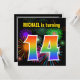 Este design de convite de aniversário vibrante e divertido apresenta um padrão colorido inspirado em fogos de artifício comemorativos que explodem, juntamente com o número "14" com um espectro multicolorido como o arco-íris ou padrão de gradiente. O nome na frente pode ser personalizado. A parte traseira contém detalhes personalizados sobre a parte. Convites de festas de aniversários como este podem ser enviados a potenciais participantes para uma festa de aniversário que se realiza para celebrar o décimo quarto aniversário de alguém. [~Z0000337]