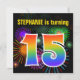 Este design de convite de aniversário vibrante e divertido apresenta um padrão de fogos de artifício celebratórios coloridos, inspirado no espetáculo, juntamente com o número "15", que inclui um espectro multicolorido como o arco-íris ou um padrão de gradiente. O nome na frente pode ser personalizado. A parte traseira apresenta detalhes personalizáveis sobre a parte. Convites de festas de aniversários como este podem ser enviados a potenciais participantes para uma festa de aniversário que comemora o décimo quinto aniversário de alguém. [~Z0000337]