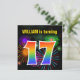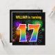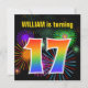 Este design de convite de aniversário vibrante e divertido apresenta um padrão colorido inspirado em fogos de artifício comemorativos que explodem, juntamente com o número "17" com um espectro multicolorido como o arco-íris ou padrão de gradiente. O nome na frente pode ser personalizado. A parte traseira contém detalhes personalizados sobre a parte. Convites de festas de aniversários como este podem ser usados para convidar convidados para uma festa de aniversário que está sendo realizada para comemorar o décimo sétimo aniversário de alguém. [~Z0000337]