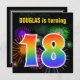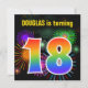 Este design de convite de aniversário vibrante e divertido apresenta um padrão colorido inspirado em fogos de artifício comemorativos que explodem, juntamente com o número "18" com um espectro multicolorido como o arco-íris ou padrão de gradiente. O nome na frente pode ser personalizado. A parte traseira apresenta detalhes personalizáveis sobre a parte. Convites de festas de aniversários como este podem ser usados para convidar convidados para uma festa de aniversário que está sendo realizada para comemorar o décimo oitavo aniversário de alguém. [~Z0000337]